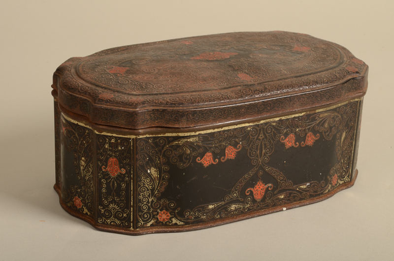 - Ovaal blik met scharnierend deksel. Het oppervlak is zwart met rode bloemen. De bodem van het blik is gemerkt met: Wagemakers' Levensmiddelenbedrijf Oss.