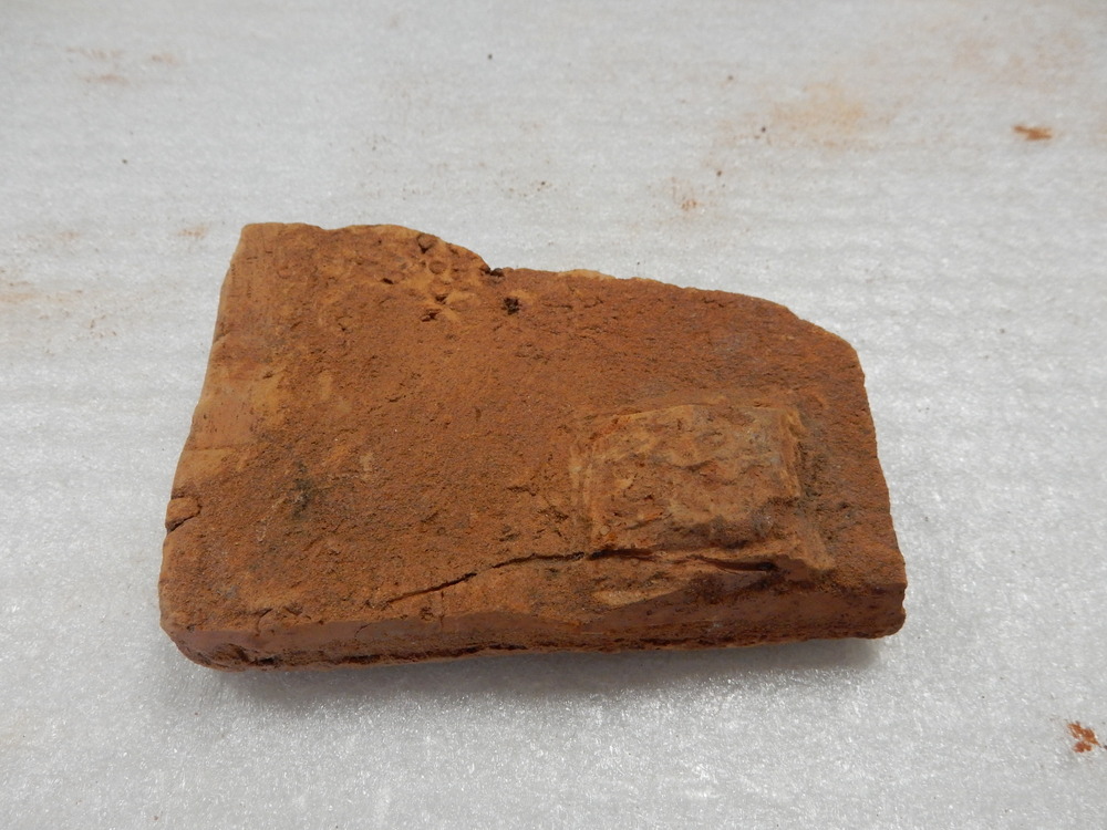 gedeelte van rode kleien(?) dakpan van het kasteel van Oss, doorbraak zuidmuur laag B.