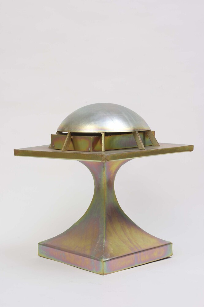 Vierkante metalen poot met vierkant blad waarop de afbeelding van een rond gebouw. Geheel is uitgevoerd in geelachtig metaal.