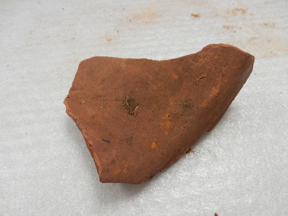 gedeelte van rode kleien(?) dakpan van het kasteel van Oss, doorbraak zuidmuur laag B.
