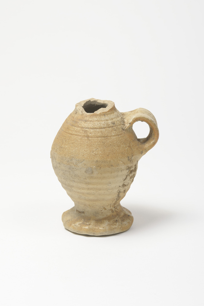 Kannetje/kruikje van het Siegburg-type. Gemaakt van grijsgebakken grijs-oranje aardewerk. Voet versierd met 'vingerafdrukken', lichaam gedeeltelijk met horizontale lijnen. De hals ontbreekt volledig. Waarschijnlijk tussen 1400 en 1500 gemaakt, zogenoemd 'proto-steengoed'. Vindplaats ontbreekt.